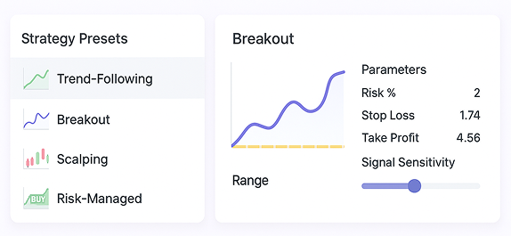 Strategy Presets let users start trading instantly with proven, pre-built trading strategies designed by experienced traders. Instead of building from scratch, you can simply select a preset that matches your style—whether you prefer trend-following, breakout setups or risk-managed scalping. Each preset comes with default parameters, risk settings and trigger conditions that you can use as-is or customize with just a few clicks. This makes trading more accessible for beginners while giving advanced users a fast way to deploy ideas without manual coding. It’s the fastest route from concept to execution inside Charts Connect.